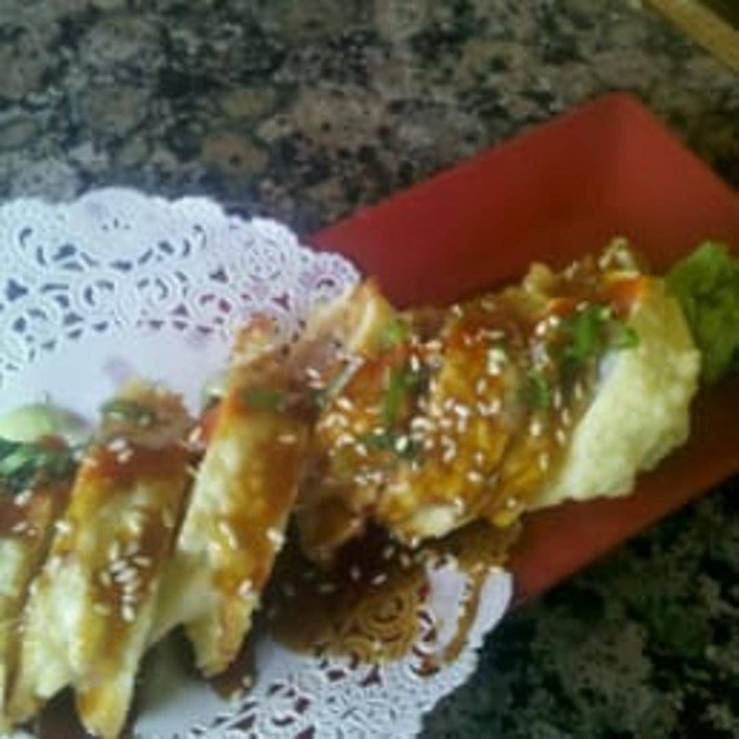 A California roll base topped with sliced avocado and drizzled with eel sauce.