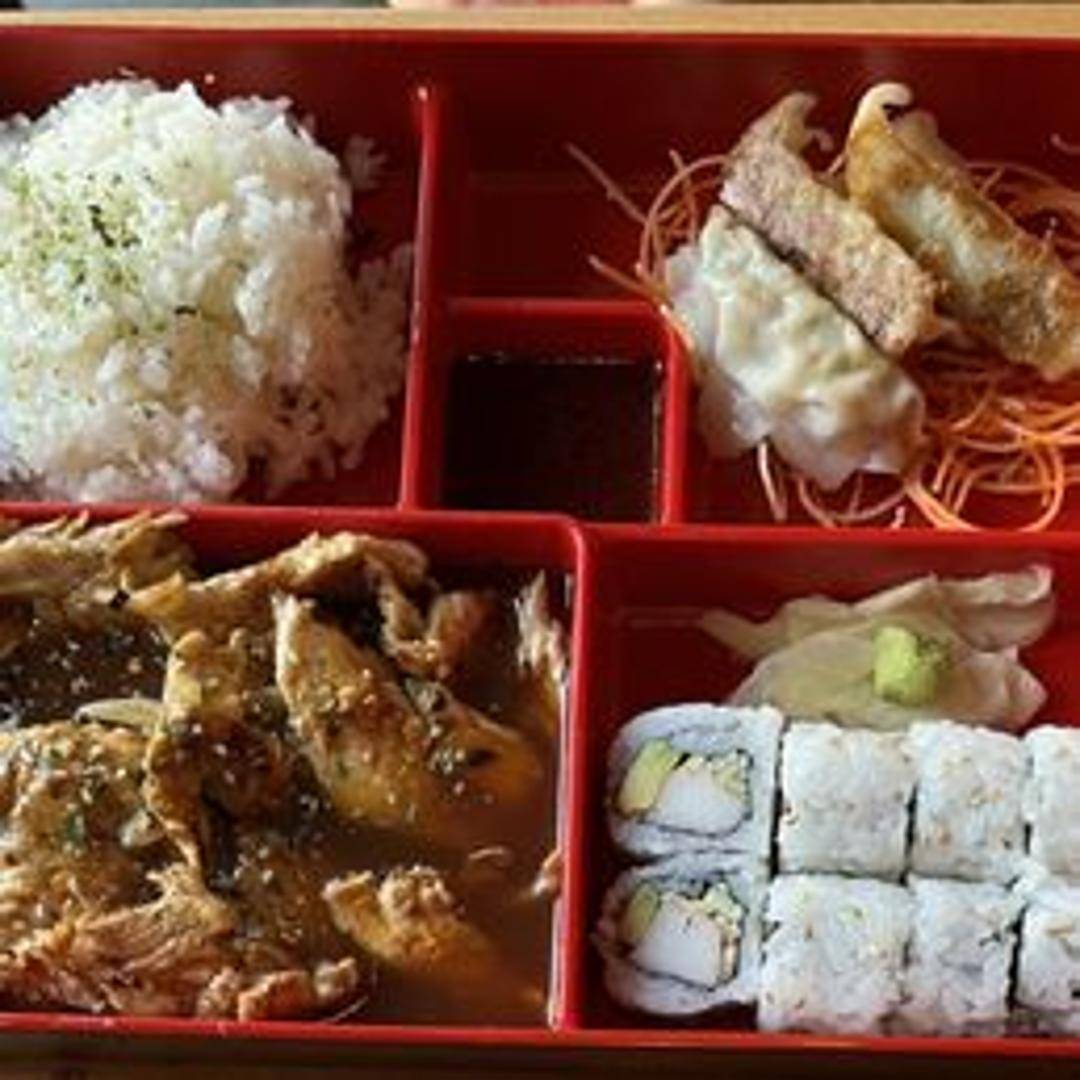 A complete meal featuring grilled chicken glazed with teriyaki sauce, served with rice, assorted vegetables, and often includes sides like dumplings or a California roll in a compartmentalized box.