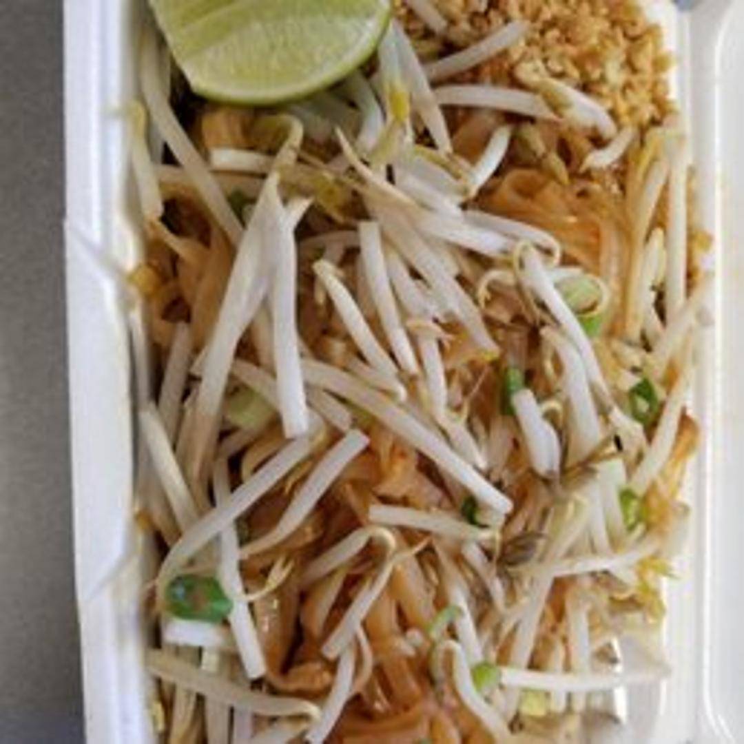 A classic Thai noodle dish featuring stir-fried rice noodles with tender chicken, bean sprouts, scrambled egg, and crushed peanuts in a savory-sweet-and-sour tamarind sauce. Garnished with fresh cilantro and a wedge of lime.