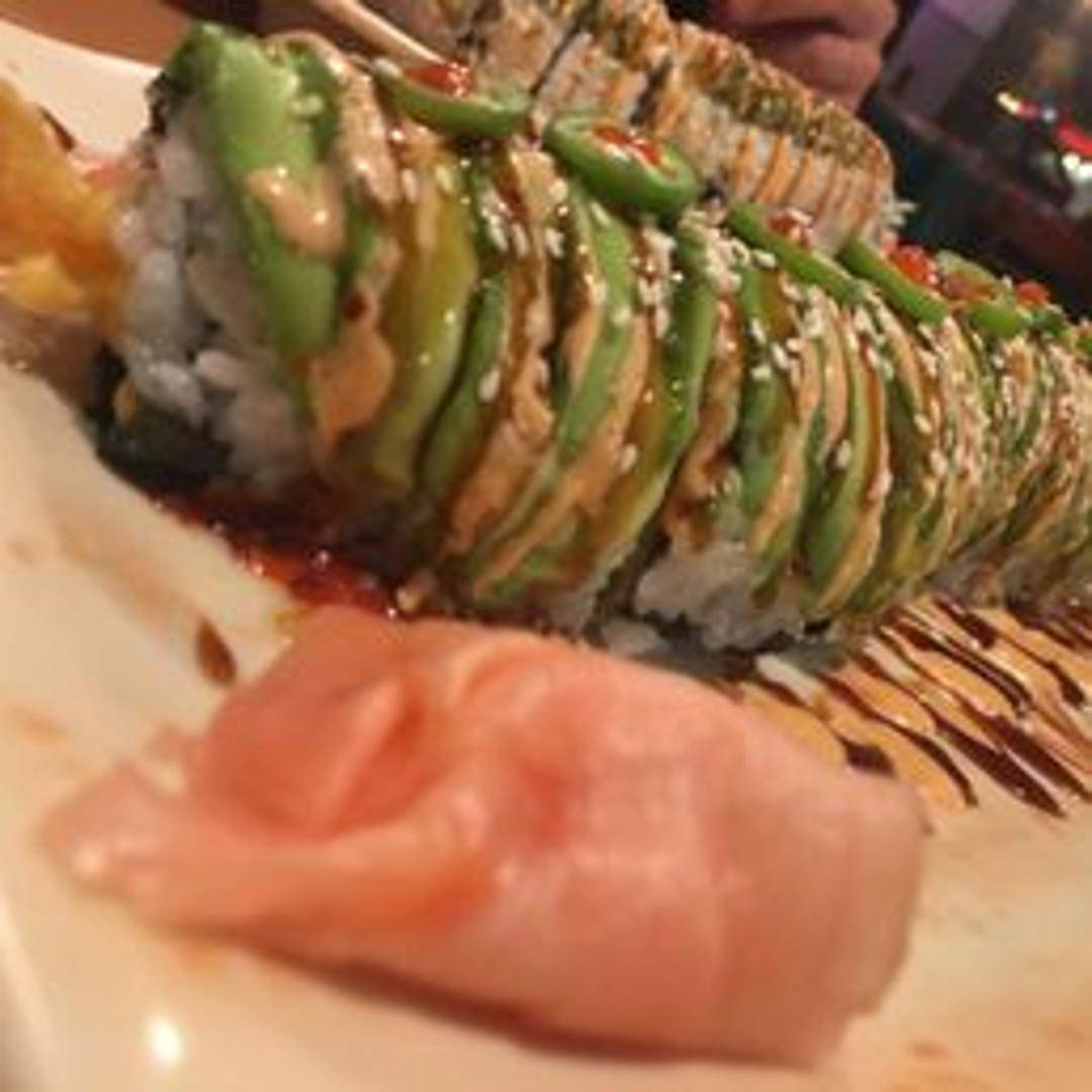 A vibrant sushi roll featuring shrimp tempura and cucumber inside, topped with spicy tuna, avocado, and a drizzle of spicy mayonnaise or sriracha sauce. Often garnished with masago (smelt roe) and sesame seeds for added texture and flavor.