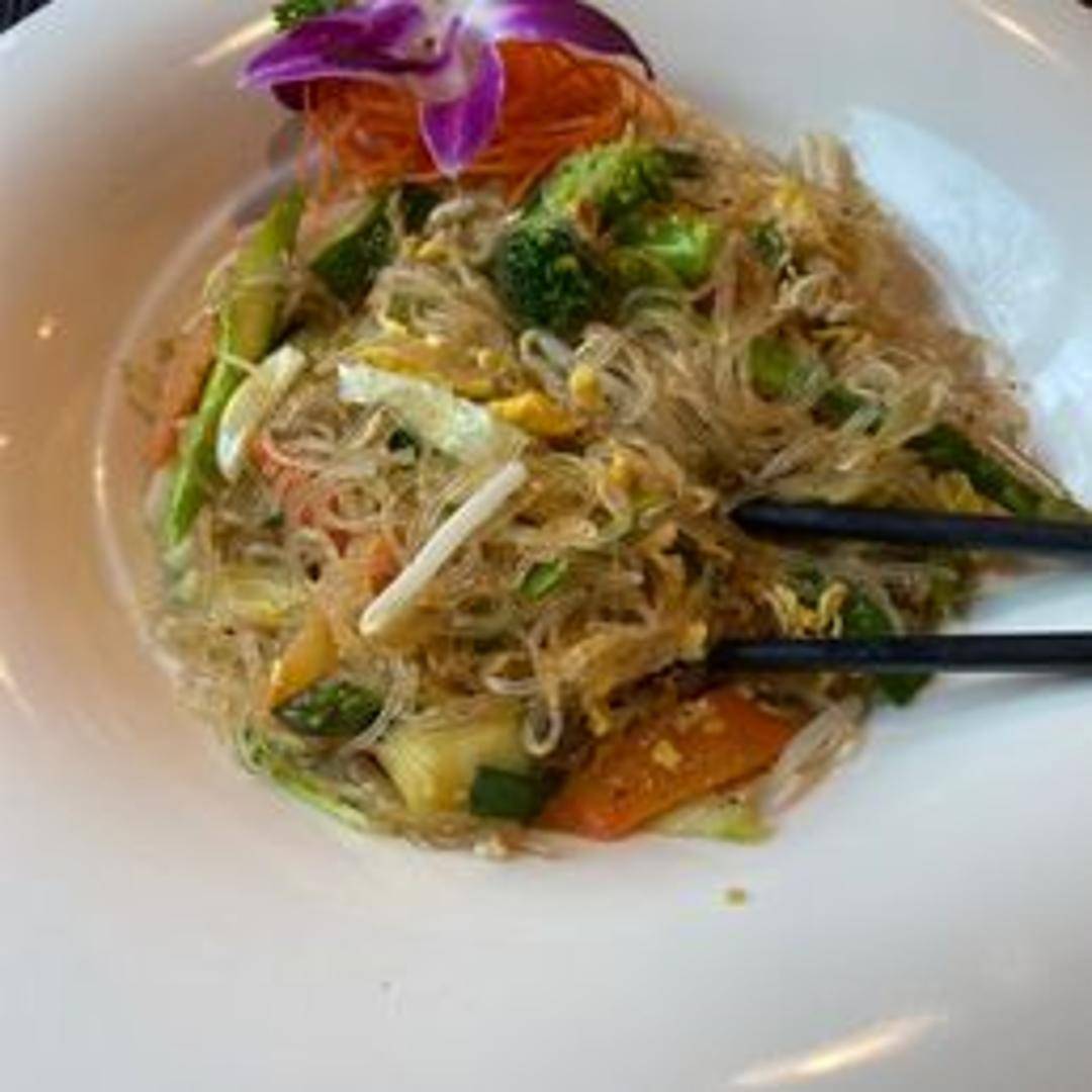 Stir-fried glass noodles with vegetables, egg, and your choice of protein: chicken, pork, beef, tofu, or shrimp.