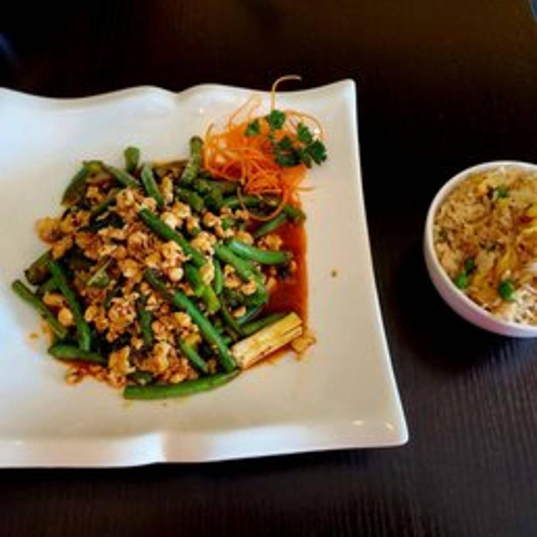 A stir-fried dish with your choice of protein (chicken, pork, beef, tofu, or shrimp), basil, garlic, chilies, and soy sauce. Served over rice.