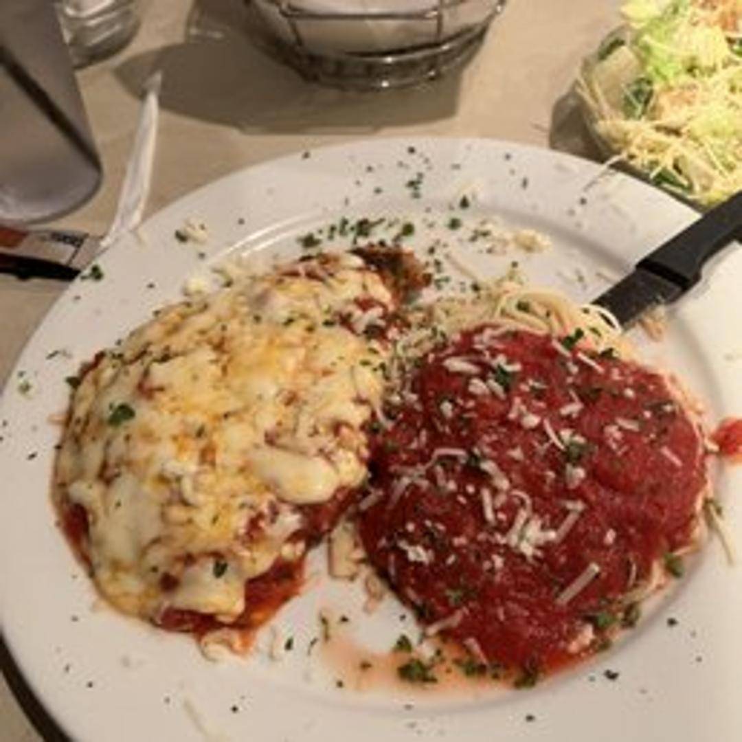 A breaded and pan-fried chicken breast topped with marinara sauce and melted mozzarella cheese. Served over a bed of spaghetti.