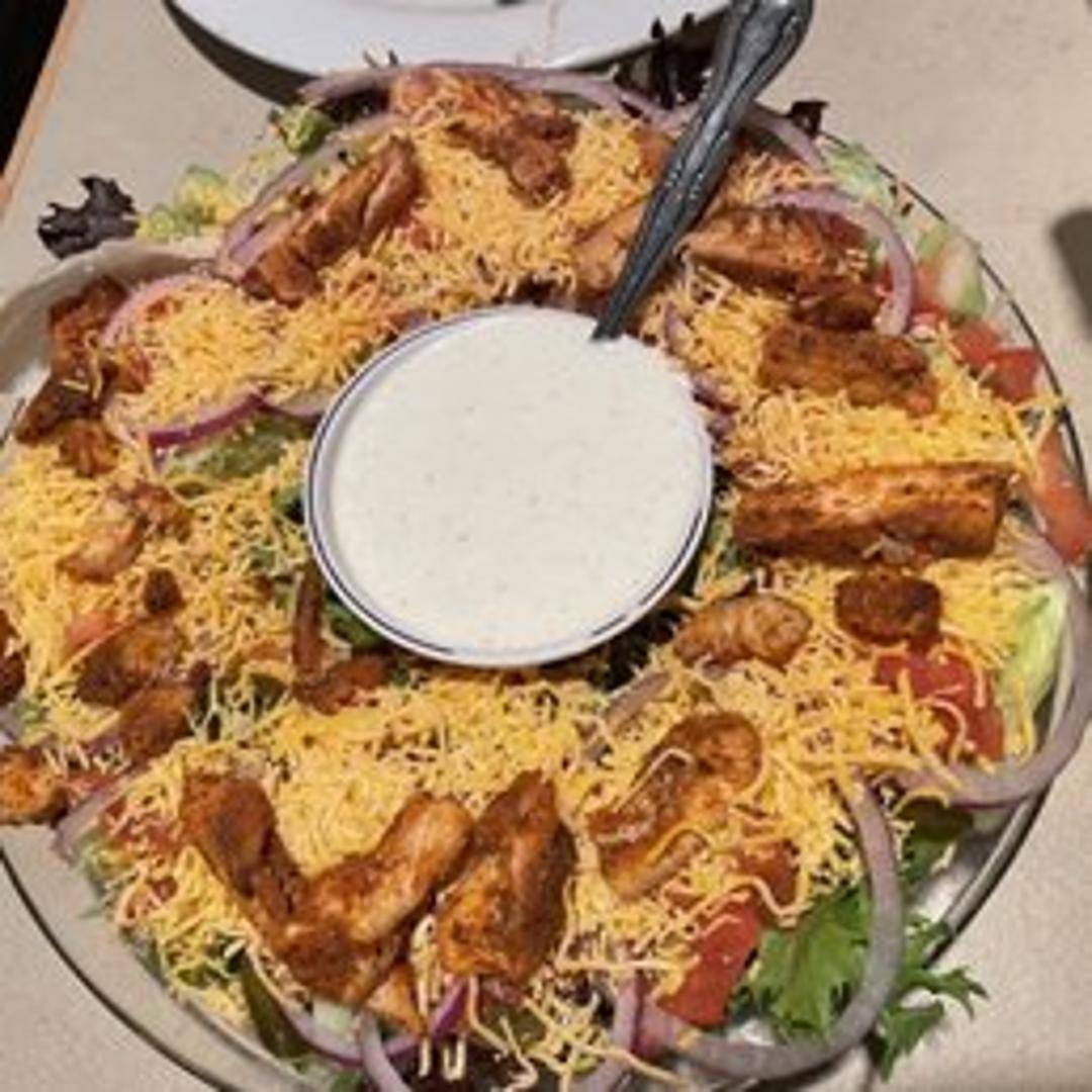 Spice-rubbed blackened chicken breast served over a bed of mixed greens with tomatoes, cucumbers, red onion, and your choice of dressing.