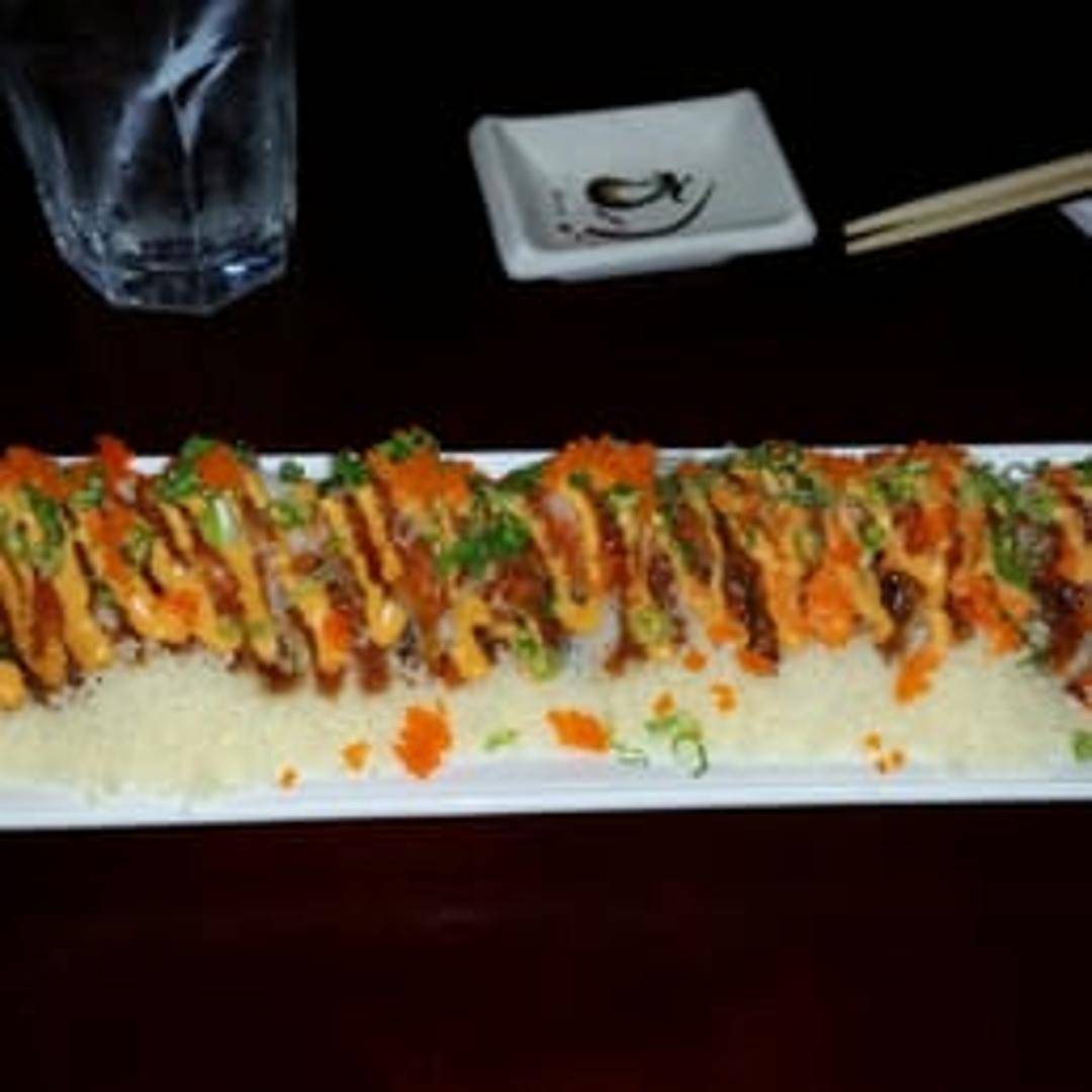 A tempura-battered and deep-fried sushi roll. Specific ingredients vary but typically include tuna, avocado, cream cheese, and a spicy sauce.