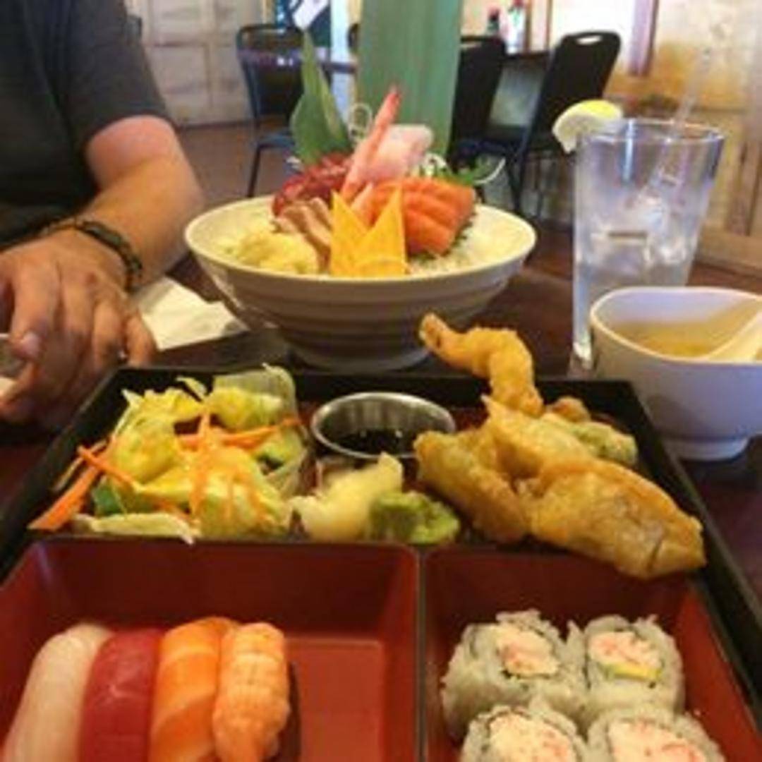 A combination meal featuring a selection of sushi rolls (typically California roll and/or tuna roll), along with other Japanese side dishes such as edamame, seaweed salad, and a protein like teriyaki chicken or tempura.