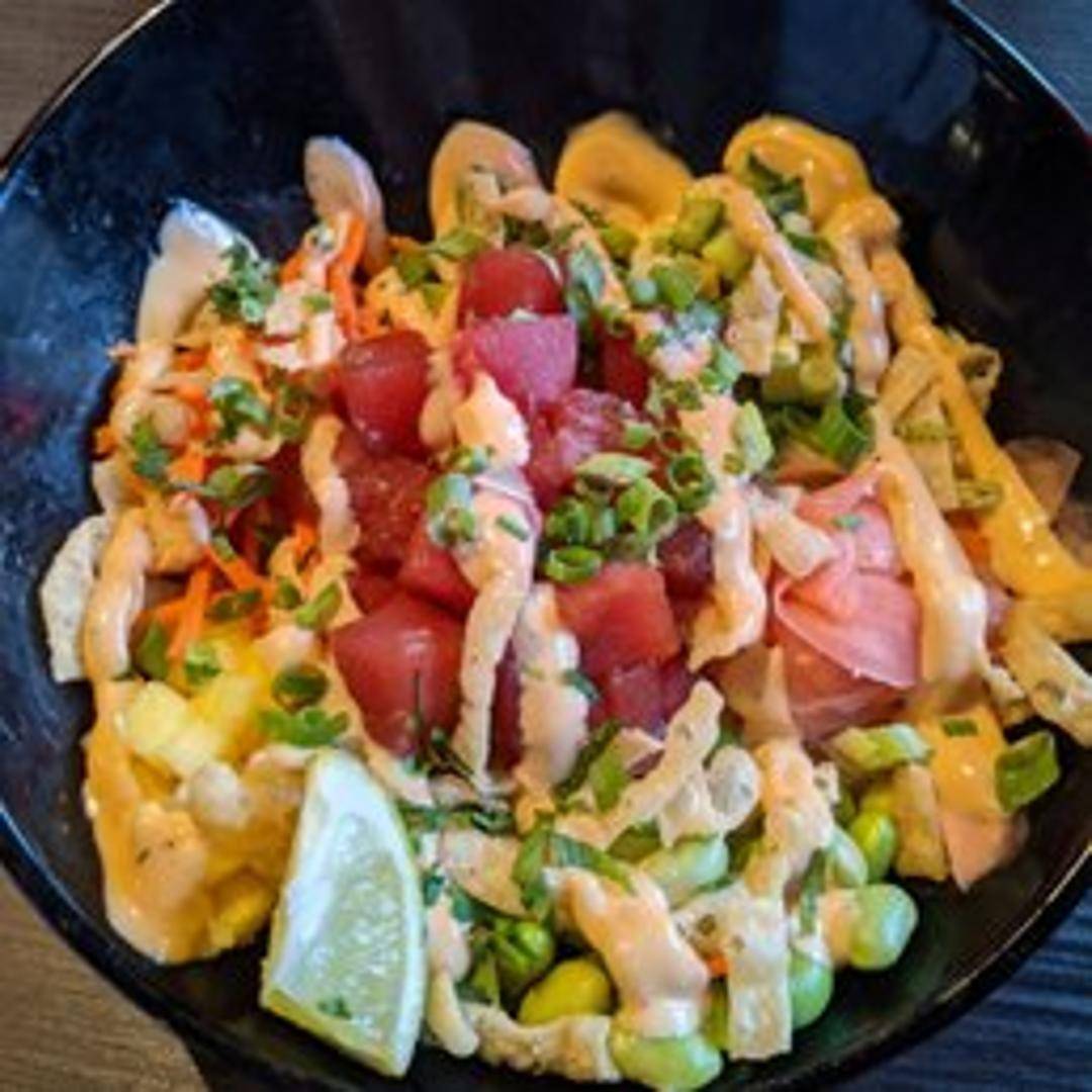 Freshly diced raw fish (usually tuna or salmon) marinated in a savory sauce, served over sushi rice with a variety of toppings such as avocado, seaweed salad, edamame, mango, and sesame seeds. Finished with a drizzle of spicy mayo or other complementary sauce.