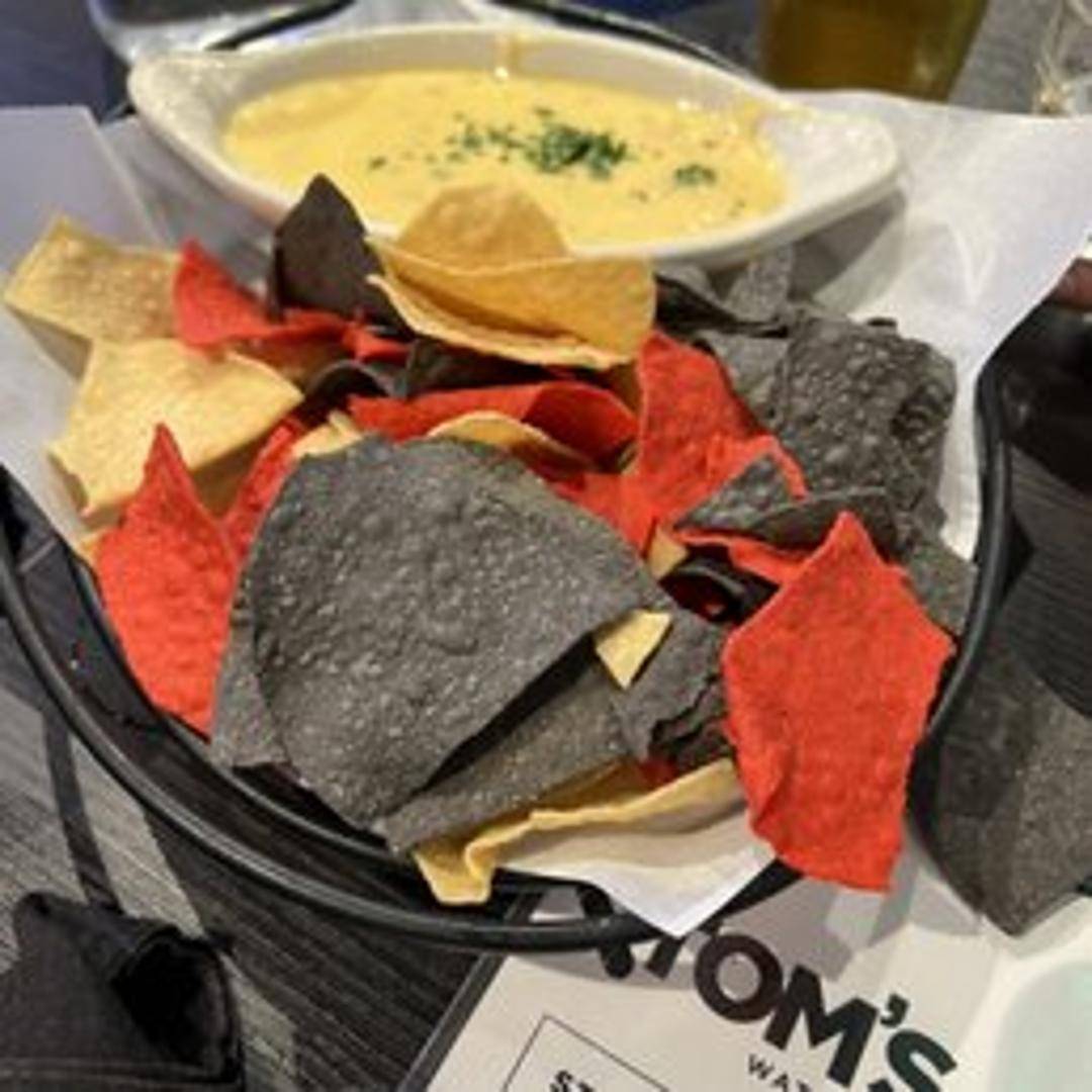 Warm, house-made tortilla chips served with a creamy, melted cheese dip featuring a blend of cheeses and spices.