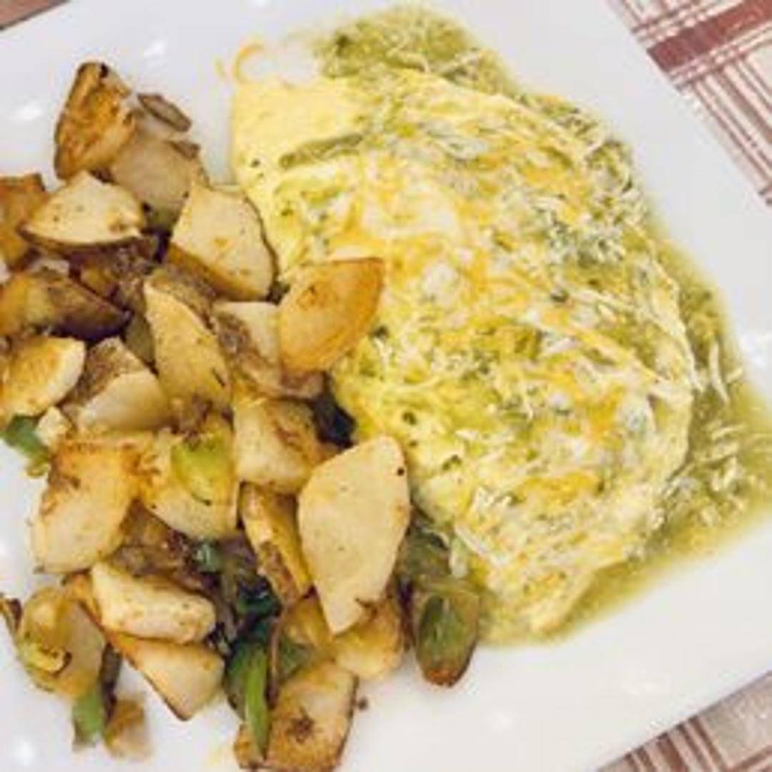Fluffy three-egg omelette filled with tender pork simmered in a flavorful green chile sauce and topped with melted Monterey Jack cheese. Served with your choice of toast and potatoes.
