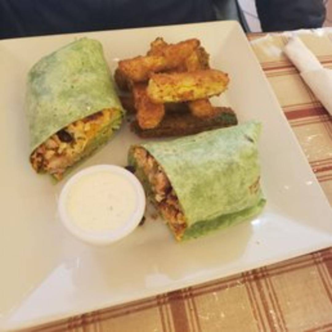 Blackened mahi-mahi fillet wrapped in a warm flour tortilla with shredded cabbage, diced tomatoes, cilantro-lime dressing, and a spicy aioli. Served with a side of coleslaw.