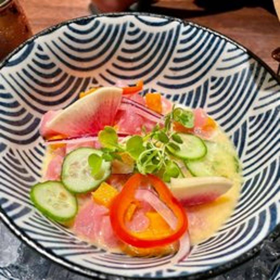 Fresh, raw fish marinated in citrus juices, typically lime, and seasoned with ají peppers, onions, and cilantro.