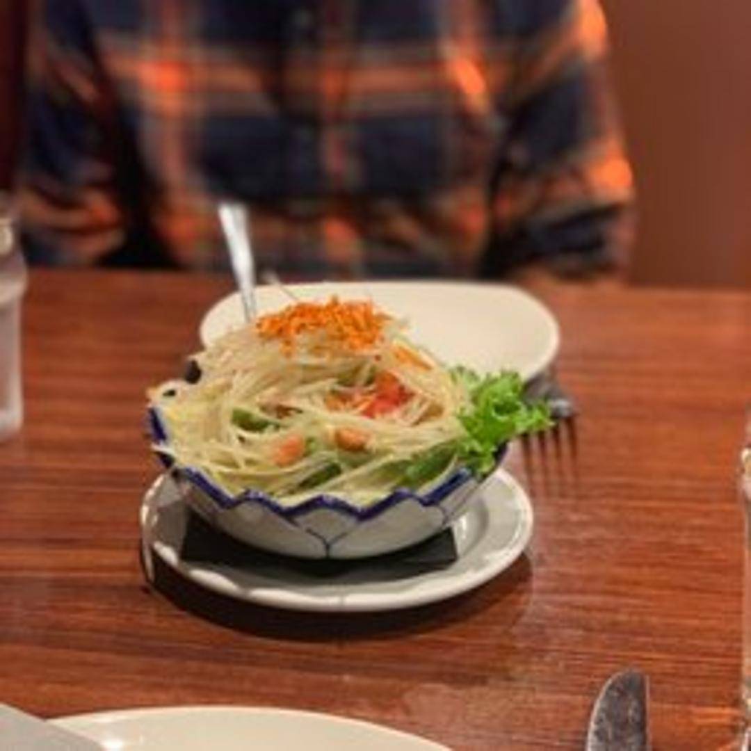 A refreshing and zesty Thai salad made with shredded green papaya, tomatoes, green beans, carrots, roasted peanuts, garlic, and chili, all tossed in a tangy lime dressing. Offers a delightful balance of sweet, sour, spicy, and savory flavors.