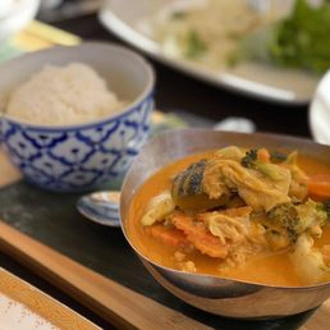 A rich and creamy Thai curry featuring tender pumpkin simmered in coconut milk with red curry paste, bell peppers, and basil leaves. Choose your protein: tofu, vegetables, chicken, pork, beef, or shrimp.