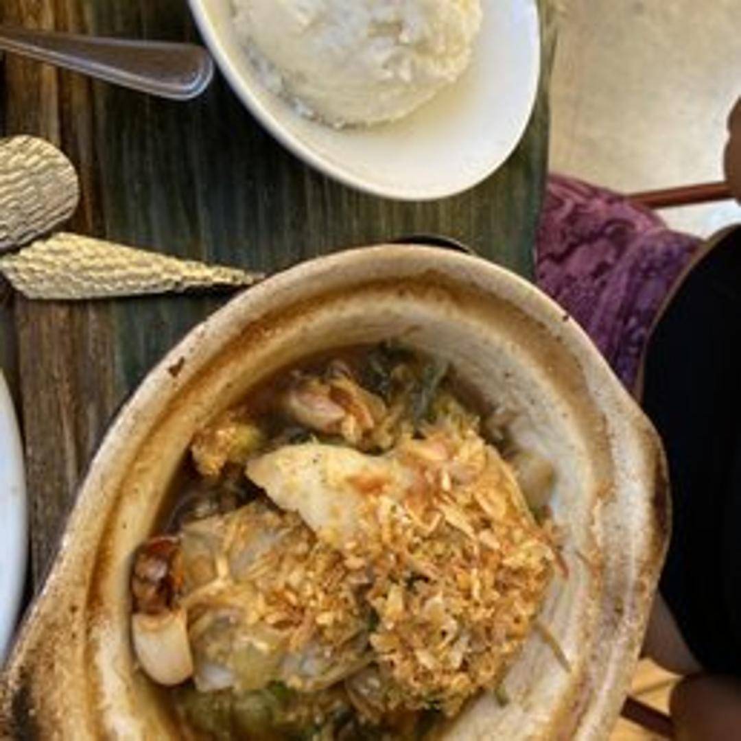Pan-seared sea bass fillet marinated in a fragrant lemongrass and herb blend. Served with a side of steamed jasmine rice and stir-fried vegetables in a light garlic sauce. The dish offers a balance of delicate fish, aromatic herbs, and fresh vegetables.