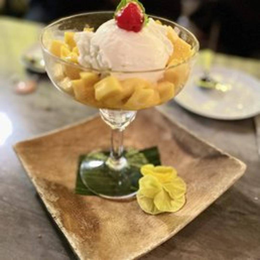 Sweet sticky rice cooked in coconut milk, served with fresh slices of ripe mango and a drizzle of coconut cream.