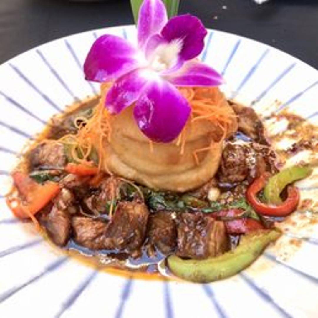 Tender slices of marinated beef, stir-fried with a fiery blend of chili peppers, garlic, onions, bell peppers, and basil leaves in a rich and savory sauce. Served on a sizzling plate, emitting smoky vapors, and accompanied with steamed jasmine rice.