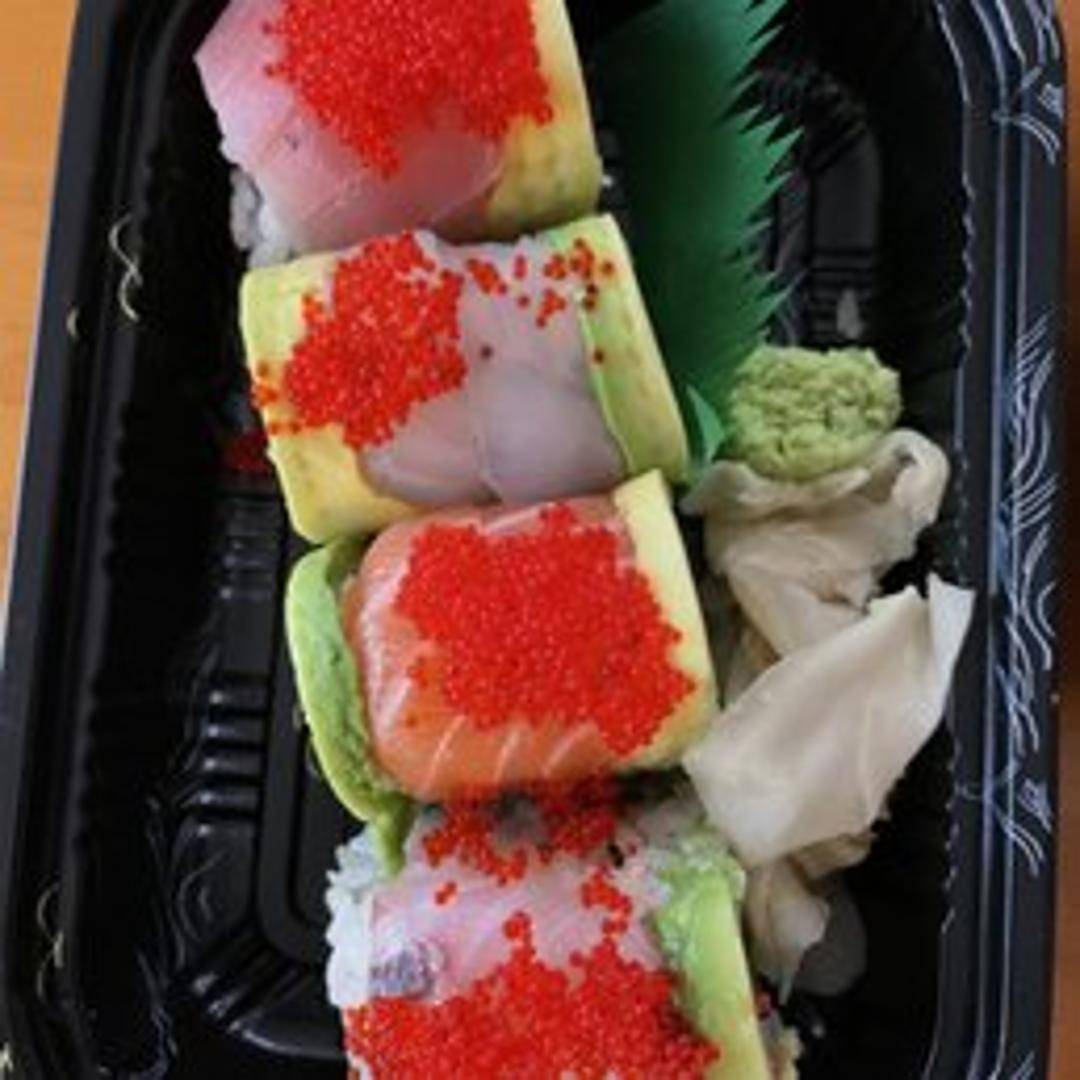 An vibrant and artful sushi creation, the Rainbow Roll features a beautiful array of fresh, thinly sliced fish (such as tuna, salmon, and yellowtail) elegantly draped over a sushi roll filled with creamy avocado and imitation crab. A feast for both the eyes and the palate, offering a delightful spectrum of flavors and textures.