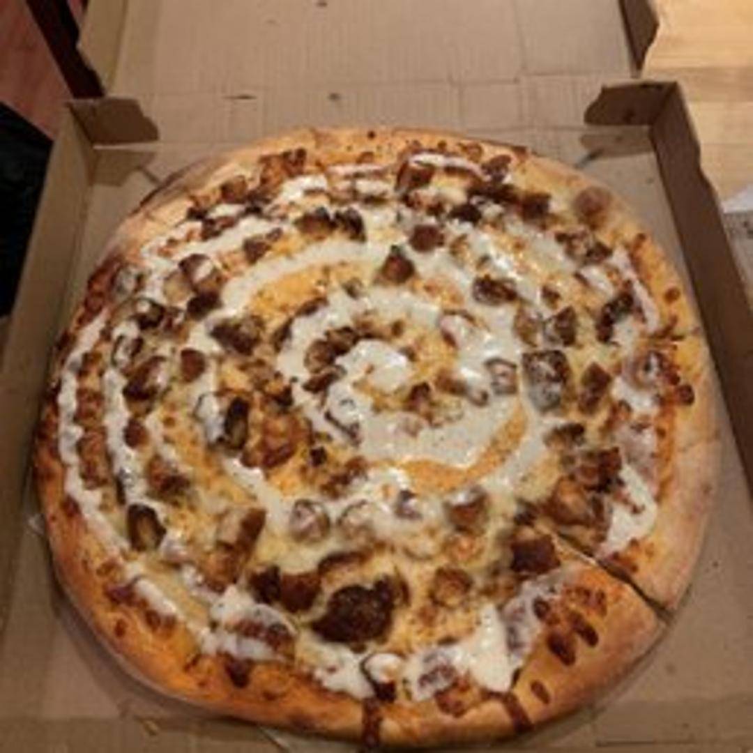 Pizza topped with grilled or crispy chicken tossed in buffalo sauce, mozzarella cheese, and a drizzle of ranch or blue cheese dressing.