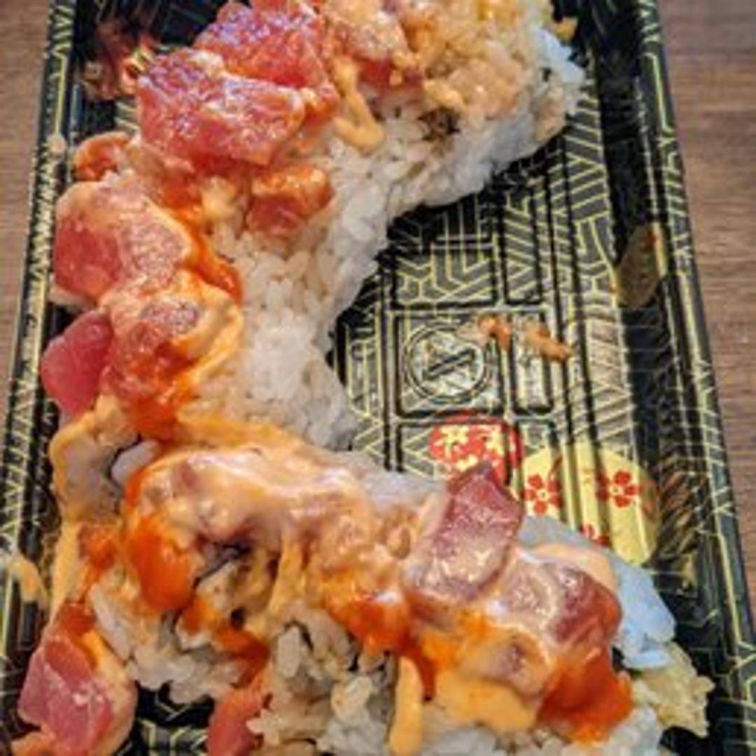 A spicy and flavorful sushi roll with a fiery kick. Contains shrimp tempura, cream cheese, avocado, and a spicy mayo sauce, all wrapped in seaweed and rice.