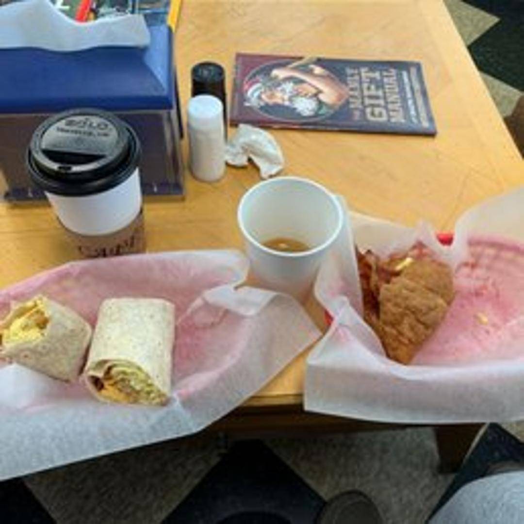 A flaky, buttery croissant filled with savory crispy bacon, a fluffy scrambled egg, and melted cheese. A classic breakfast sandwich for a quick and satisfying start to your day.