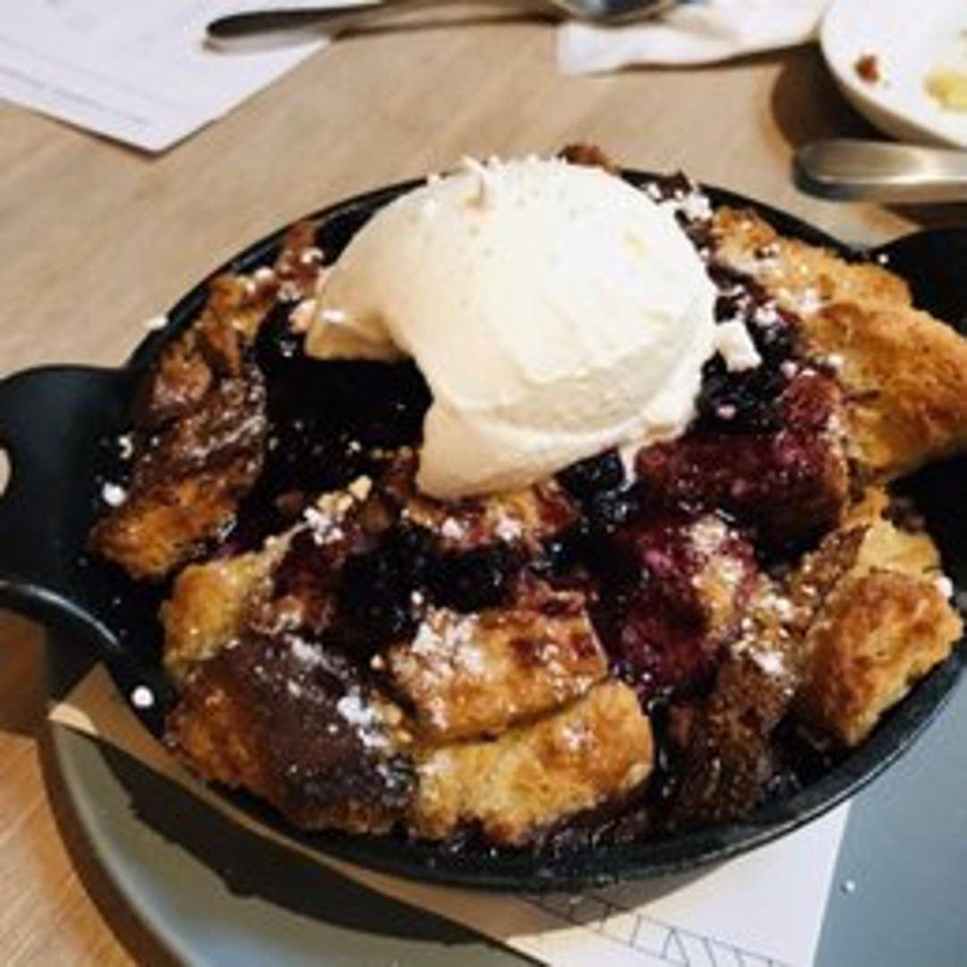 Thick-cut brioche soaked in vanilla custard and griddled in a cast iron skillet. Served with seasonal fruit compote, whipped cream, and a drizzle of maple syrup.