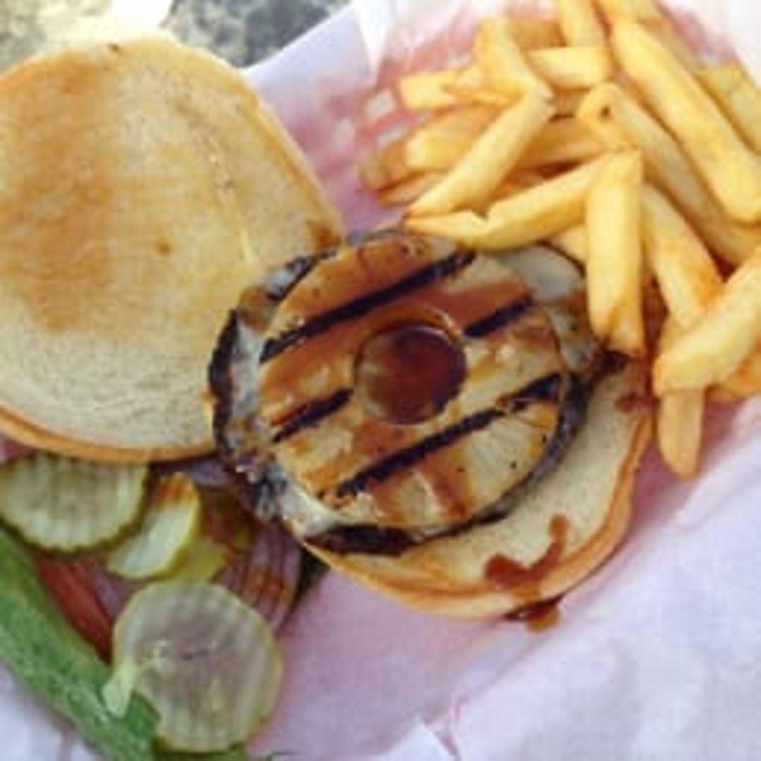 Juicy beef patty topped with grilled pineapple, Swiss cheese, teriyaki glaze, lettuce and tomato on a toasted bun. Served with your choice of side.