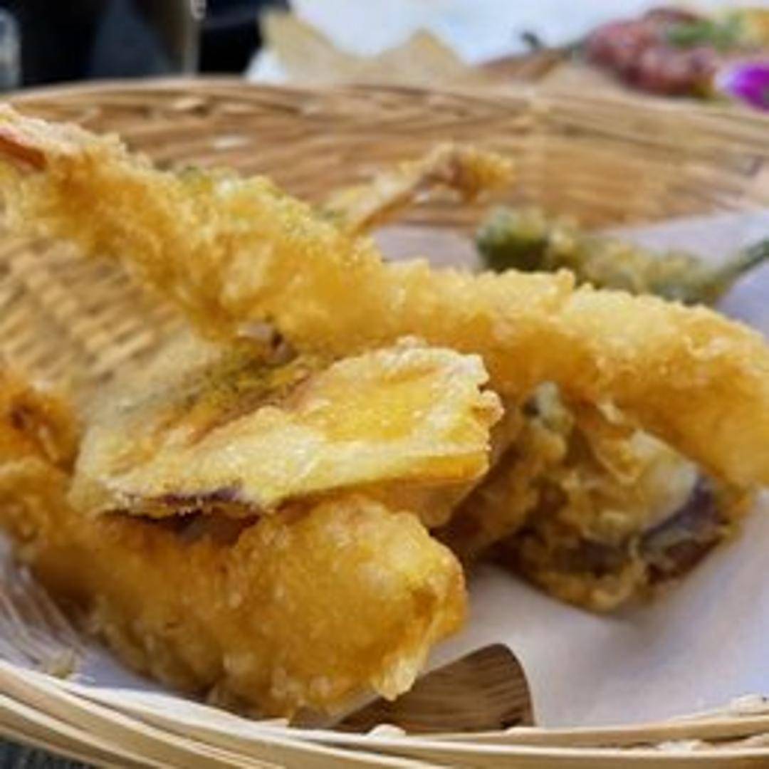An assortment of lightly battered and deep-fried seafood and vegetables. Includes shrimp, white fish, sweet potato, pumpkin, and green beans. Served with a tentsuyu dipping sauce.