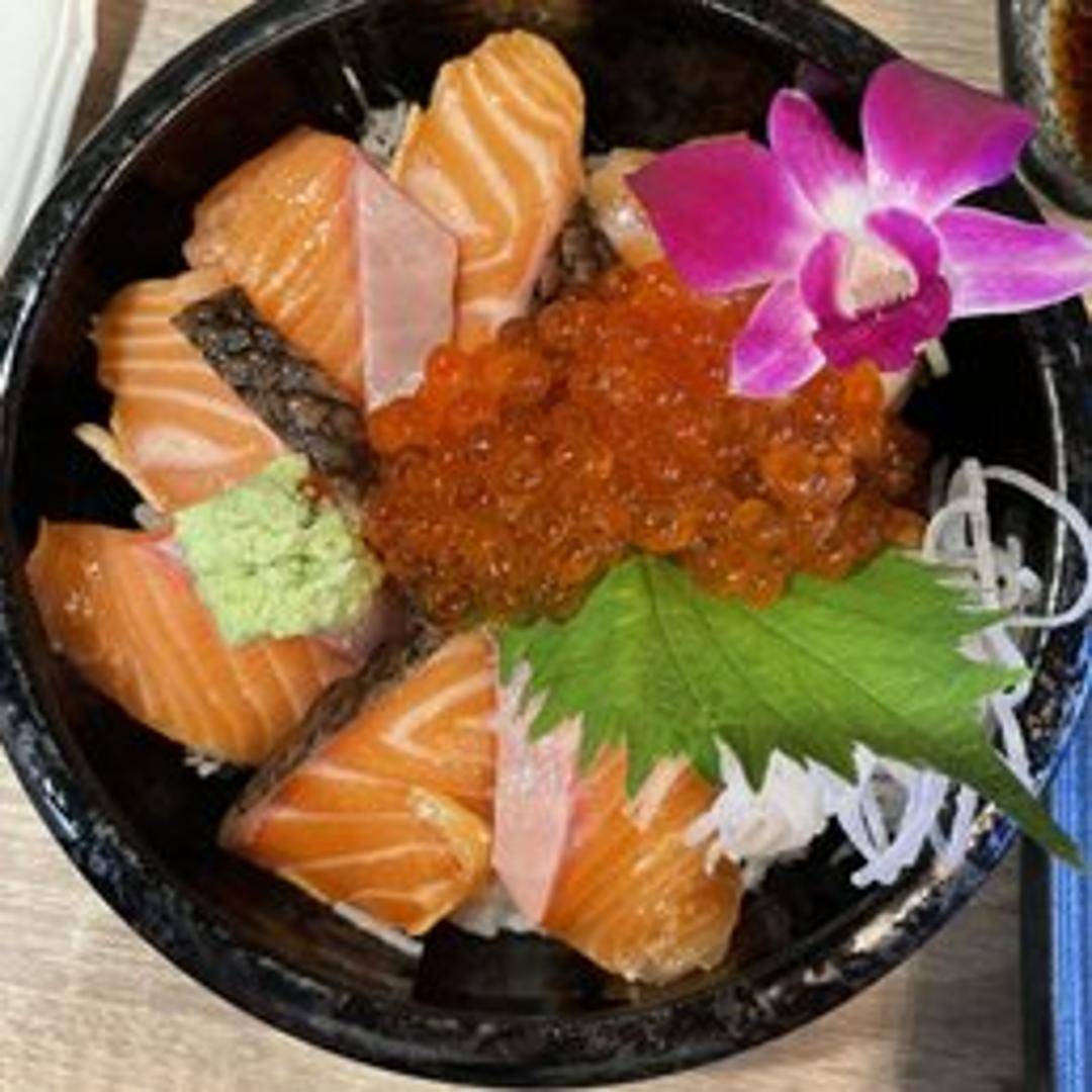 A delightful rice bowl featuring fresh, succulent slices of salmon (sake) and glistening salmon roe (ikura) atop a bed of perfectly seasoned sushi rice. Served as a lunch special at Toyosu, this dish includes a side of miso soup and Japanese pickles.