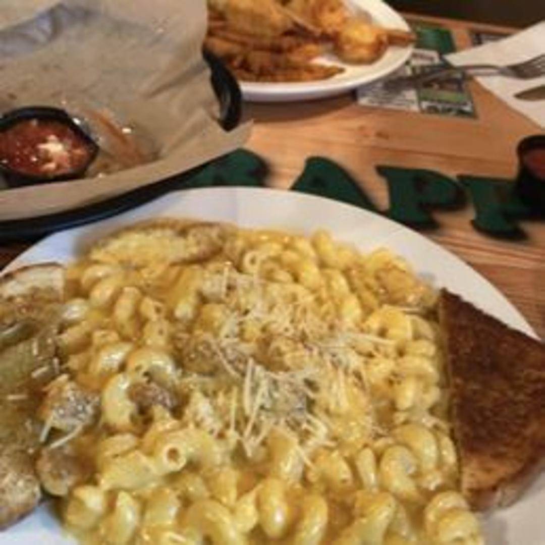 Creamy macaroni and cheese kicked up a notch with spicy buffalo sauce and tender pieces of chicken [or specify other meat/protein]. Topped with a drizzle of ranch or blue cheese dressing.