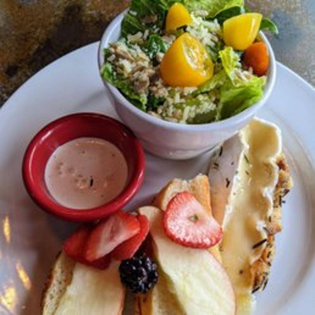 Creamy brie cheese baked until warm and gooey, served with crusty bread and a sweet fruit compote.