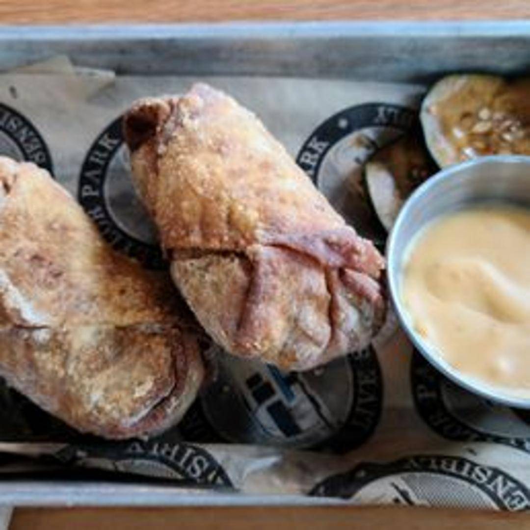 Crispy egg rolls filled with the classic flavors of a Philly Cheesesteak. Features thinly sliced steak, melted cheese (typically provolone or cheese whiz), and caramelized onions, all wrapped in a crispy egg roll wrapper. Served with a dipping sauce, such as sriracha ketchup or cheese sauce.