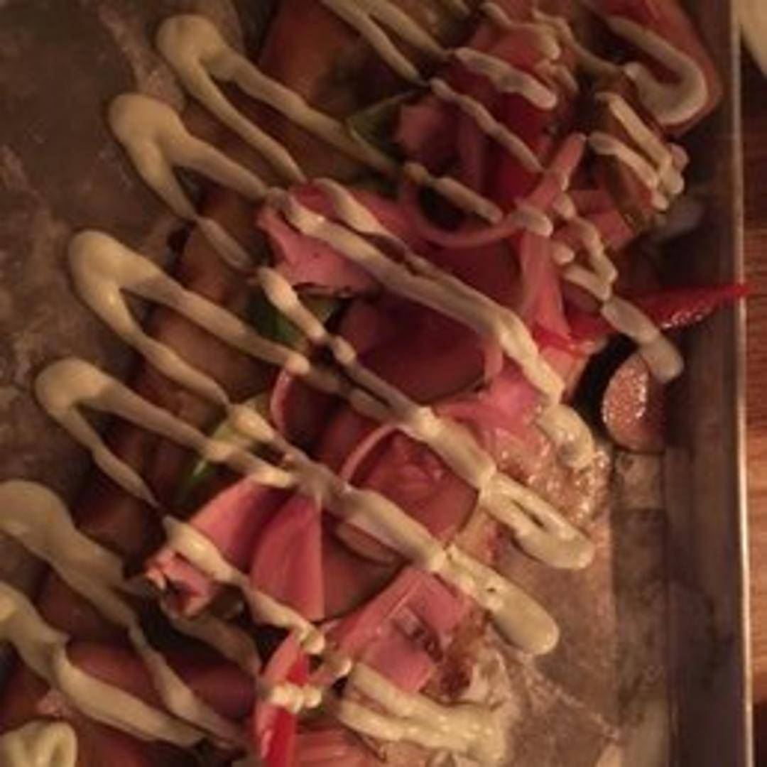 Seared ahi tuna served in a warm tortilla with a flavorful slaw, spicy mayo, and sesame seeds.
