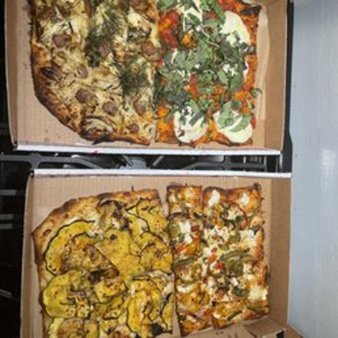 Roasted acorn squash, sage, brown butter, and parmesan cheese combine for a sweet and savory autumnal pizza. The squash adds a creamy texture and a hint of sweetness, balanced by the nutty brown butter and sharp parmesan.