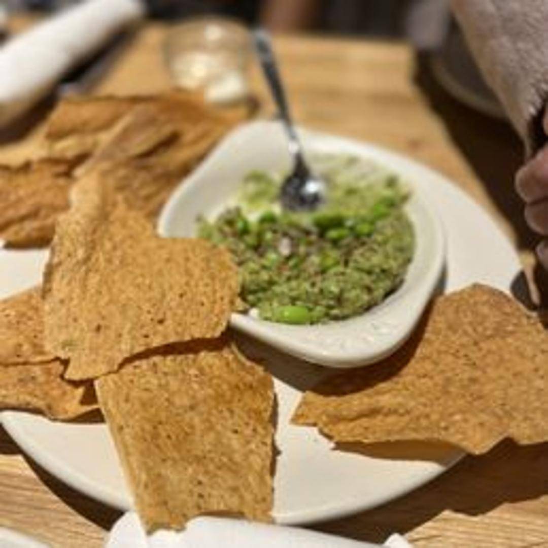 Experience a vibrant twist on a classic favorite with True Food Kitchen's Edamame Guacamole. This unique and nourishing dip combines creamy, ripe avocado with the delicate, slightly firm bite of blanched edamame, creating a delightful texture and added plant-based protein. Expertly seasoned with fresh cilantro, zesty lime, finely diced red onion, and a hint of jalapeño for a subtle kick, it offers a harmonious blend of flavors. Perfect for sharing, it's typically served with your choice of crisp crudités or wholesome, gluten-free pita or tortilla chips, making it an ideal appetizer for a healthy start.