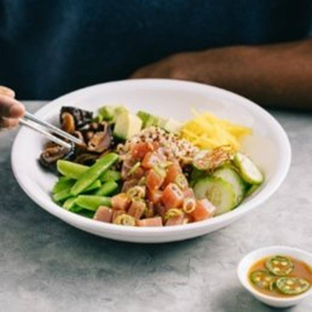 A vibrant and nutrient-packed bowl featuring fresh, sustainably sourced protein, artfully arranged over a bed of wholesome grains or greens. It's complemented by crisp vegetables, lively herbs, and a savory, house-made dressing, offering a perfect balance of flavors and textures for a light yet satisfying meal.