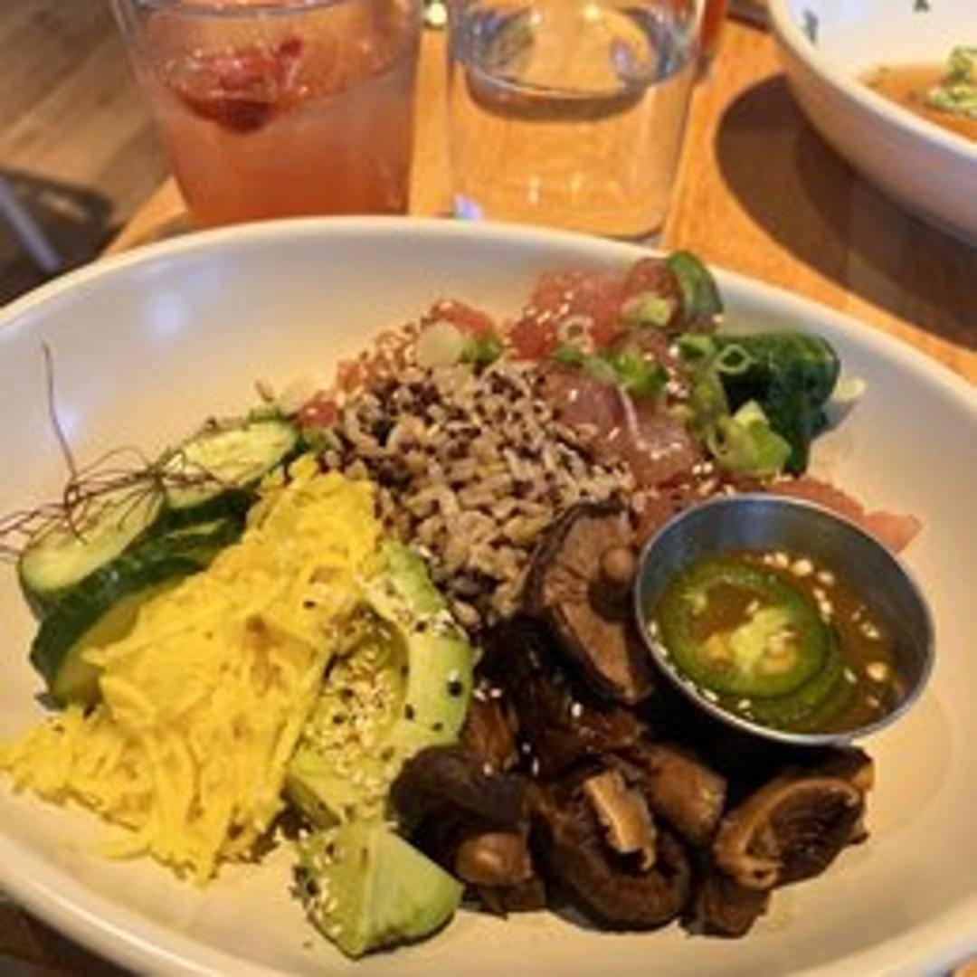 A refreshing bowl featuring sushi-grade ahi tuna or other seafood marinated in a flavorful sauce, served over a bed of brown rice or quinoa and topped with avocado, seaweed salad, edamame, cucumbers, and sesame seeds. A vibrant and customizable dish.
