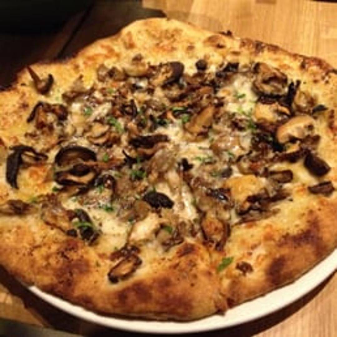 A flavorful pizza featuring a variety of wild mushrooms, often including truffle oil, herbs, and a blend of cheeses on a thin and crispy crust. A savory and earthy delight.
