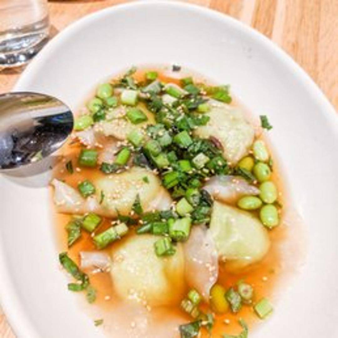 Delicate and savory dumplings filled with a creamy, flavorful blend of edamame, aromatic herbs, and finely diced vegetables. Steamed to perfection, these tender parcels are nestled in a light, umami-rich dashi broth, often garnished with fresh truffle oil and chives, offering a sophisticated and comforting appetizer.