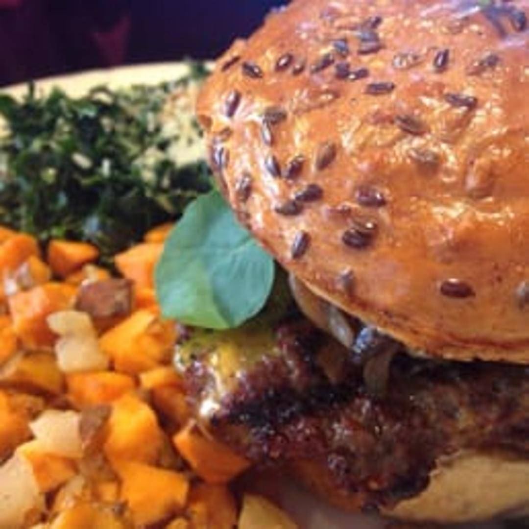A lean and flavorful grilled bison patty, seasoned to perfection and offering a rich, savory taste. This robust burger is served on a wholesome flaxseed bun, generously topped with crisp butter lettuce, ripe vine-ripened tomato, thinly sliced red onion, and a creamy, tangy house-made vegan mayonnaise, creating a satisfying and gourmet experience.