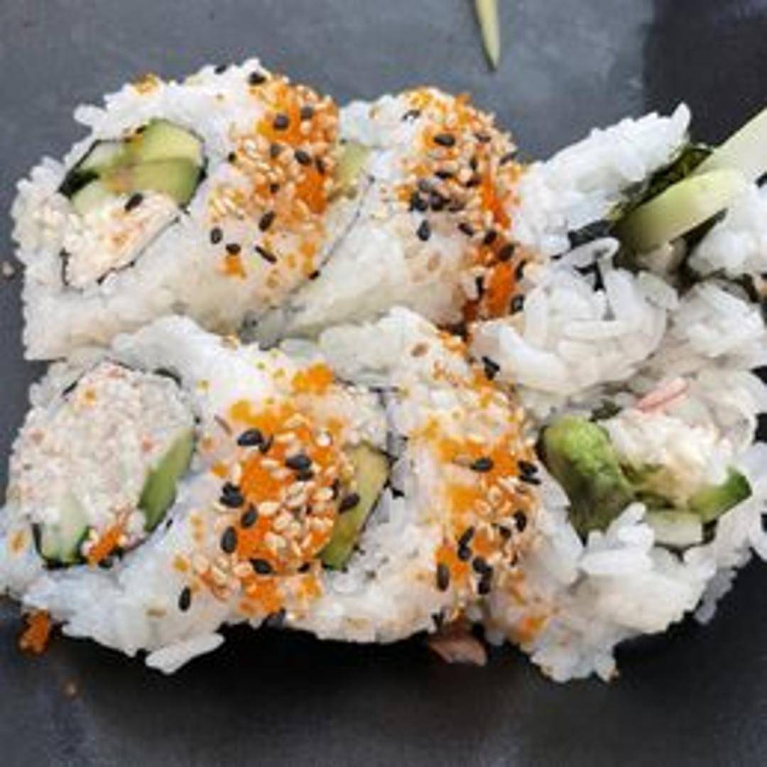 Classic sushi rolls featuring imitation crab meat, avocado, and cucumber rolled in seasoned rice and nori seaweed, topped with sesame seeds. Served with soy sauce, ginger, and wasabi.