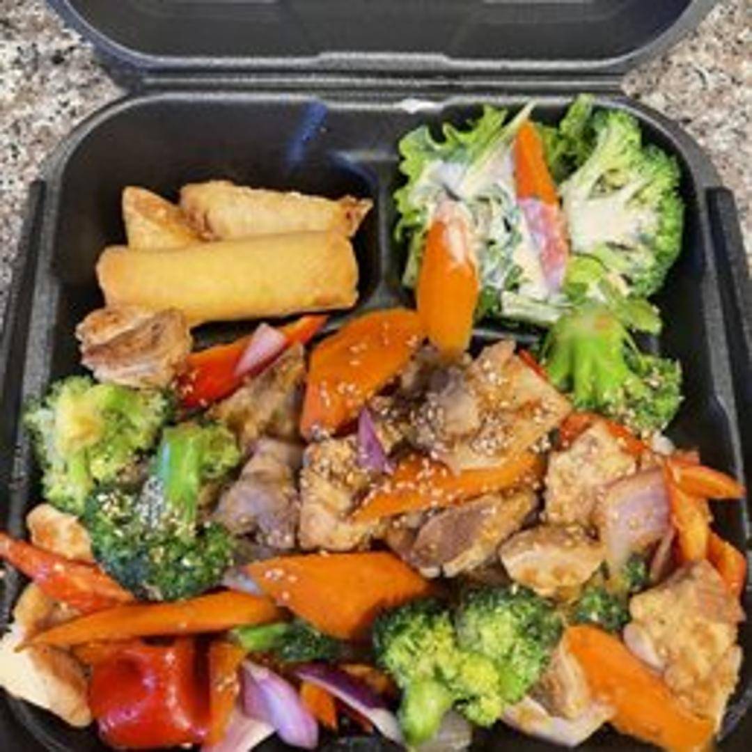 A flavorful bowl featuring your choice of grilled protein (chicken, beef, or tofu) glazed with a sweet and savory teriyaki sauce. Served over a bed of steamed rice and garnished with sesame seeds and green onions. Accompanied by a side of steamed vegetables or a small salad.