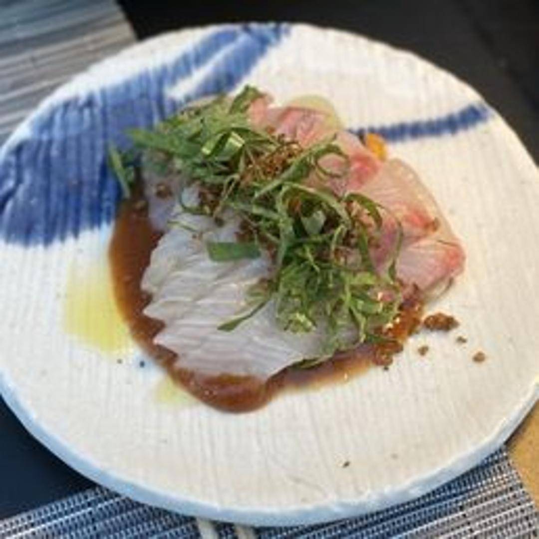 Thinly sliced kanpachi (amberjack) served raw, often with a delicate citrus-based dressing, fresh herbs, and perhaps a hint of chili. The texture is smooth and buttery, highlighting the natural flavor of the fish.