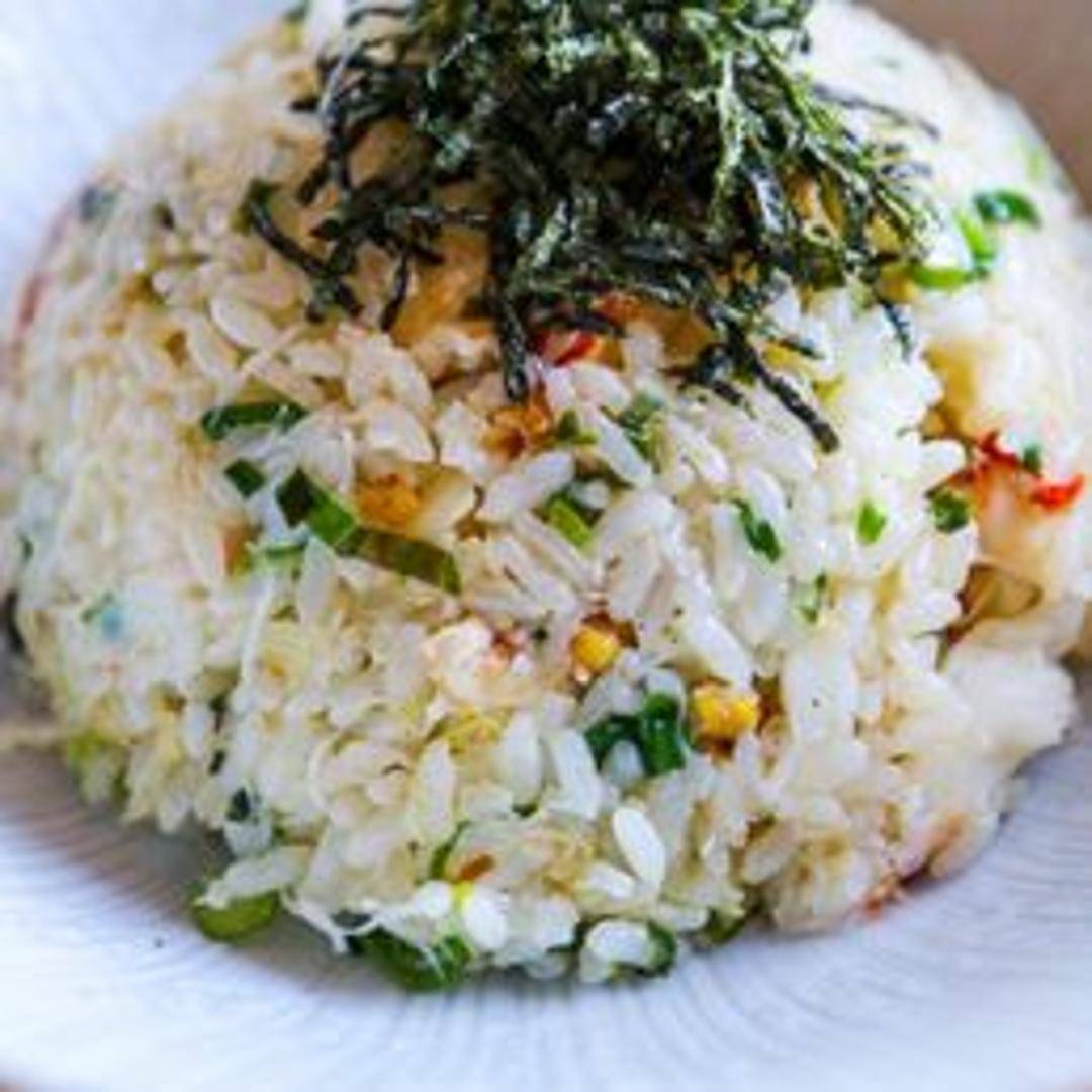 Crab fried rice. Fluffy rice stir-fried with succulent crab meat, vegetables (like peas, carrots, and scallions), and a savory sauce, possibly soy sauce or oyster sauce. A well-balanced and flavorful dish showcasing the delicate sweetness of crab.