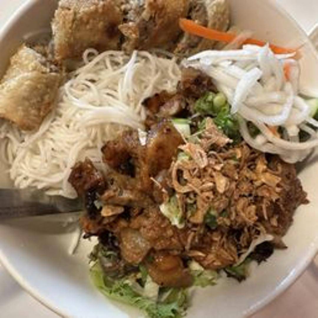 Crispy fried egg rolls filled with pork and vegetables, served with a dipping sauce.