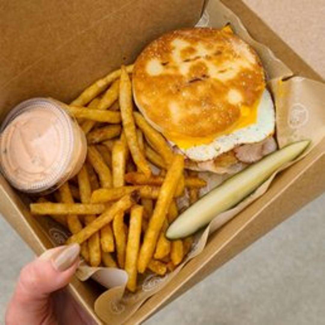 A hearty breakfast sandwich featuring your choice of breakfast meat (bacon, sausage, or ham), fluffy scrambled eggs, and melted cheese (cheddar, Swiss, or provolone) on a toasted brioche bun. Served with a side of breakfast potatoes.
