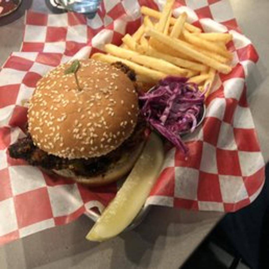 Crispy, juicy fried chicken breast tossed in our signature Nashville hot sauce, topped with creamy coleslaw, dill pickles, and comeback sauce on a toasted brioche bun. Served with a side of waffle fries.