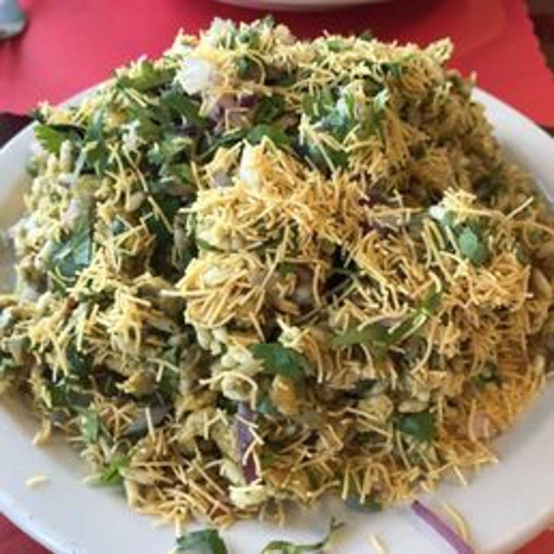A savory snack made of puffed rice, sev (thin fried noodles made from besan flour), onions, potatoes, and chutneys, offering a delightful mix of textures and flavors – tangy, sweet, and spicy.