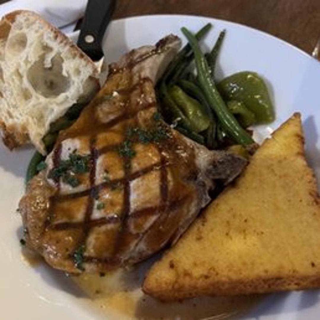 A thick-cut, bone-in pork chop, grilled or pan-seared to perfection. Seasoned with a blend of herbs and spices, it offers a savory and juicy dining experience. May be served with a side of seasonal vegetables and a complementary sauce or glaze.