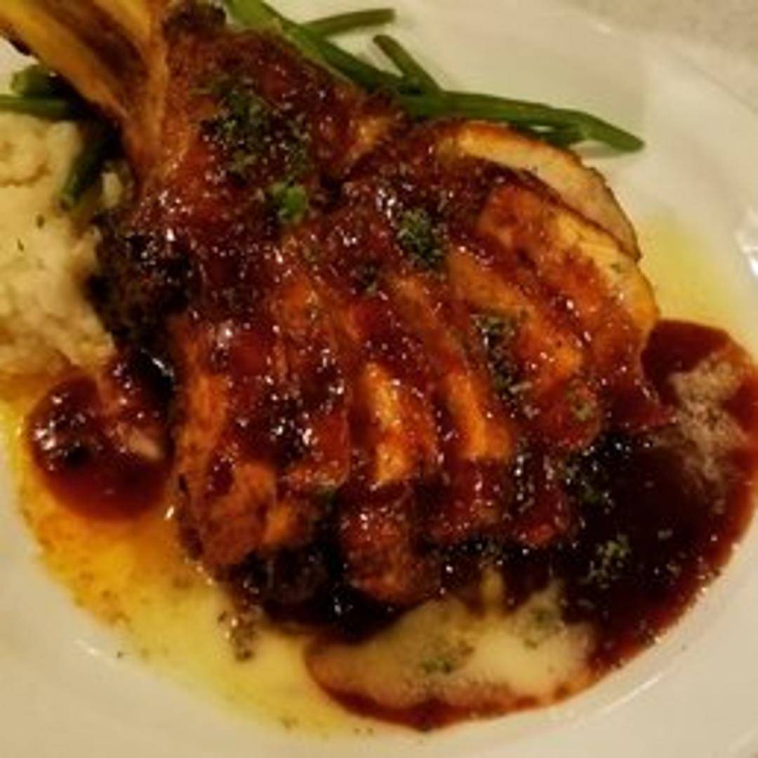 Grilled bone-in pork chop, topped with apple chutney. Served with mashed sweet potatoes and roasted asparagus.