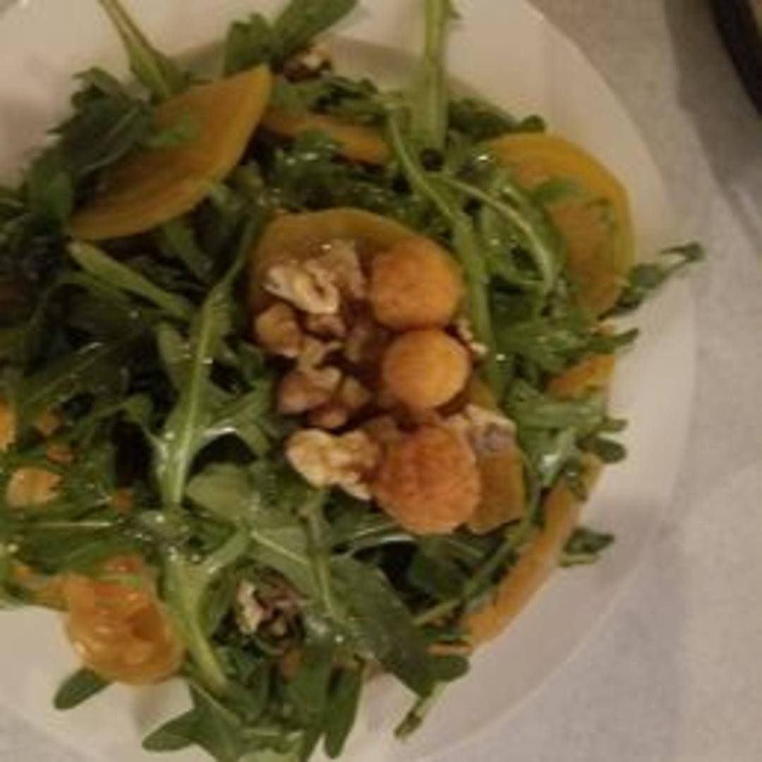 Roasted yellow beets tossed with mixed greens, goat cheese, candied walnuts, and a light citrus vinaigrette.